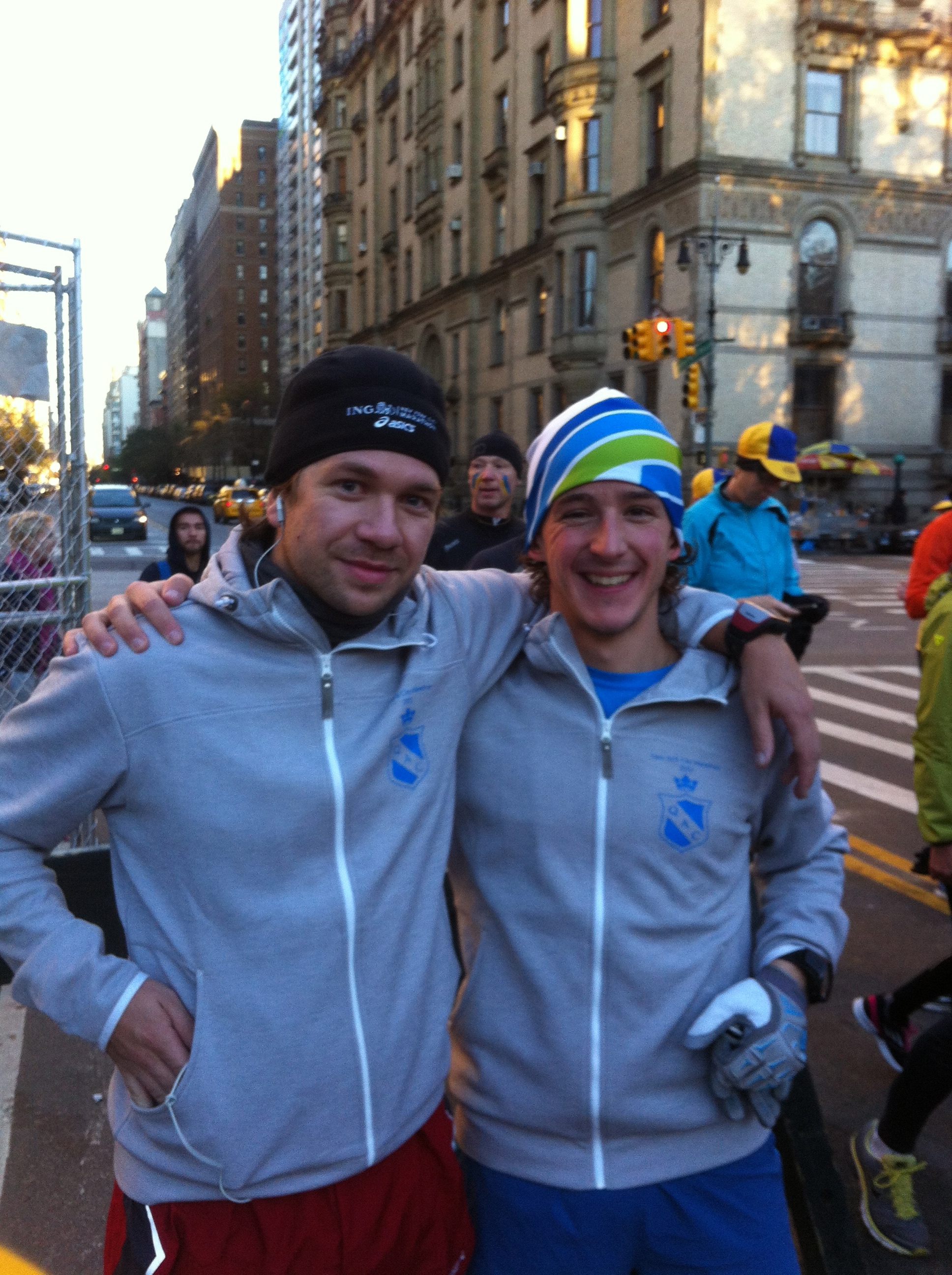 After having slapped both myself and Jakob in order to wake us up, the two of us, along with dad, lumbered down the stairs to the lobby. Per had, unbeknownst to us, already headed out for a solorun in Central Park. Starting out down 76th Street, we met up with another couple of blue-and-yellow-clad groups, and reaching the low stone wall surrounding the park, I raised my head and saw more than a hundred Scandinavian runners gathered on the road. The plan was to cover an entire lap of the outer “beltway” inside the park, a distance of 9704 metres (carefully measured by Anders Szalkai, one of Sweden’s fastest marathon runners, and a Springtime coach for the day). We were of course welcome to run more than one lap, but since there were three of us – and supposing Per had run a lap of his own – one could, and one did, argue that we indeed finished a New York City Marathon between us that day!