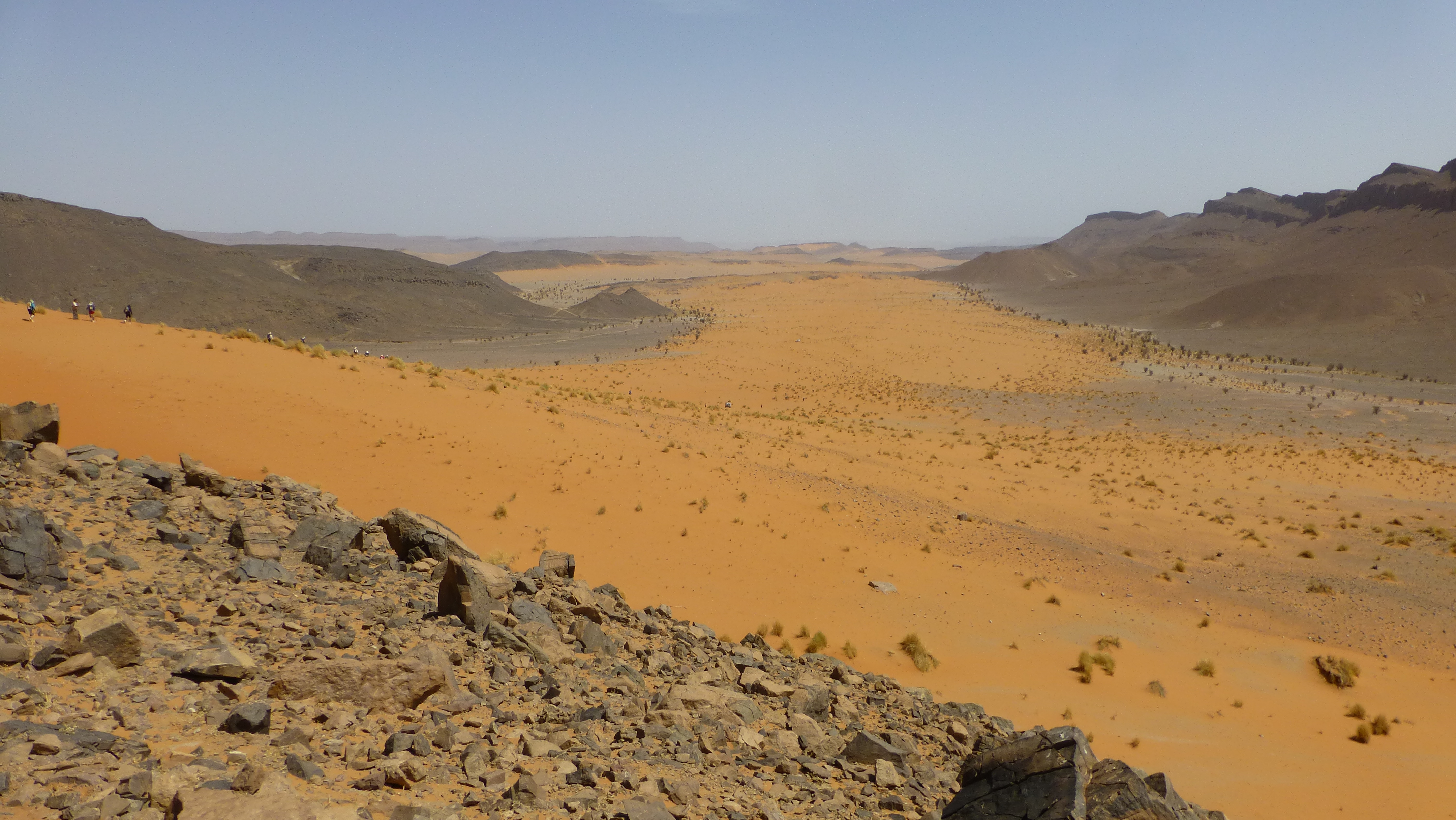 Entering a black gravelly field after passing through the dunes of Jebel Debouaâ.