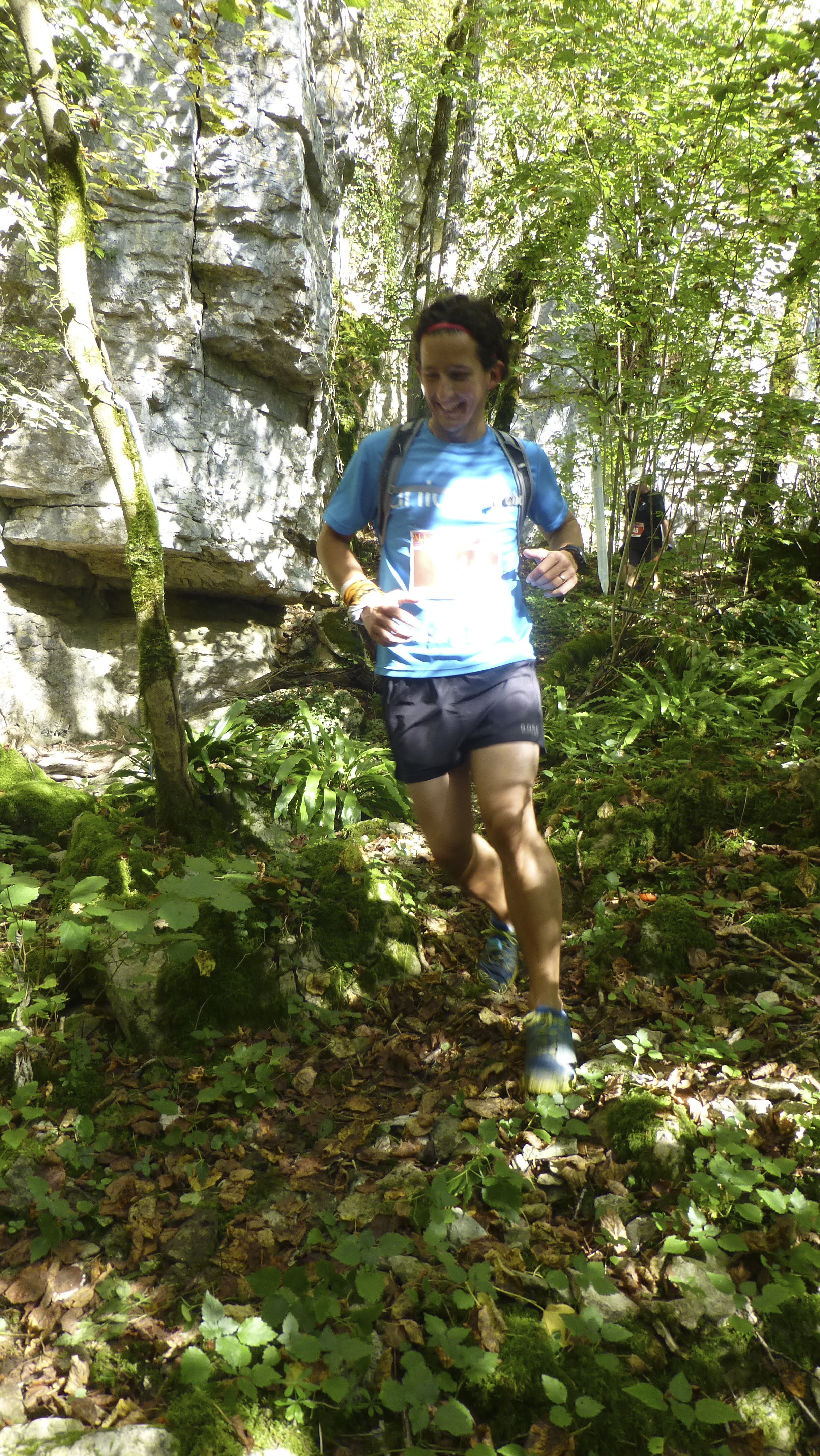 Soon enough we were thundering down a dewy wet and slippery grassy downhill that was so narrow that we scraped our shoulders against the barbed wire guarding the fields flanking the path. Reaching the misty bottom of the valley after a couple of kilometres we almost immediately turned upwards on the neighbouring knoll, diving in under the dark green canopy of birch trees and splotting down each other and our competitors with the brownish mud of the trail. After around 4k or so, Jakob abruptly stopped and started to darken the air with curses with a grimace on his face. Attached to the lateral side of his foot, a wasp was struggling feebly as it tried to dislodge itself from his sock. In the semi-glumness under the leafy trees Jakob didn’t see the wasp until it had stung his foot. Gingerly removing it, he took a few tentative steps and assured me that he was ready to go. In 7k we reached the first checkpoint where we gulped down a few mouthfuls of coke, took off our windjackets and continued on through the picturesque little medieval village of Flavigny-sur-Ozerain. Waving to one of the photographers we ran along a wall from where there was a beautiful view of the next valley. The sun started to warm our faces as we continued south along the next ridge, walking swiftly and purposefully uphill and trying to run on the flatter portions and downhill. France is a stunningly beautiful country with many different types of landscape, this race featuring rolling farmland divided by wooded hills and ridges, most of them pretty steep. Setting out during the first half-marathon we were wondering how on earth we would possibly accumulate 1800+ vertical metres but the way the trail was run, it soon dawned on us that it wouldn’t be a problem. The track was pleasantly drawn, in places pretty devilishly so, and our only issue with the race was the fact that although it was very well marked, signs of distance run (or, indeed, distance left) were sorely lacking. It wasn’t very clear if checkpoint 2 was supposed to be located at 18k (according to the map), at 20,5k (according to a handwritten sign next to the water table or 22k (according to my – which I later found out – faulty GPS). Leaving checkpoint 2 we sped past the curly-haired lady running in a dress and started one of the more vicious climbs so far. I have to say that the pisteur (the fellow that had laid down the markings) showed clear signs of genius. No only was he an expert in finding steep hillsides in the middle of flat pastures but he also had us running in the shade of huge green oaktrees and birches for the majority of the race, shielding us from the unseasonably hot sun. Running through the Forêt domainale de Flavigny was an absolute joy, jumping over rotting logs covered in emerald green moss lying over the trail and climbing down ropes strung along the steeper of the passages. And the small rivulets we splashed through only served to chill our aching feet from the repetitive lumbering along the forest trails and field tracks.